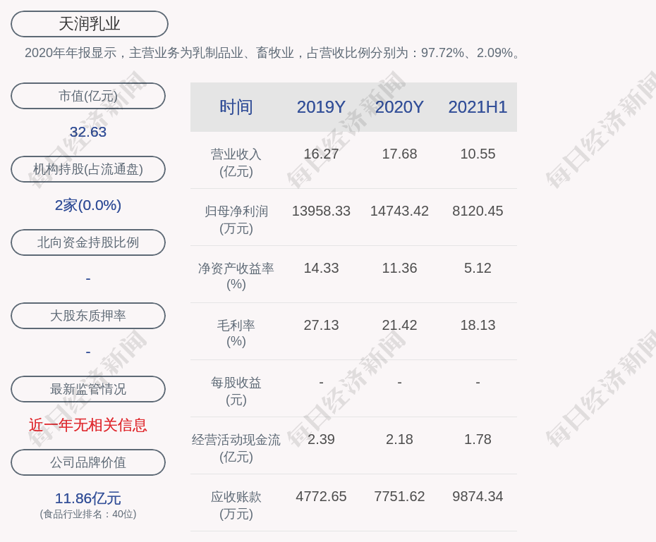2020年年报显示,天润乳业的主营业务为乳制品业、畜牧业,占营收比例分别为:97.72%、2.09%。