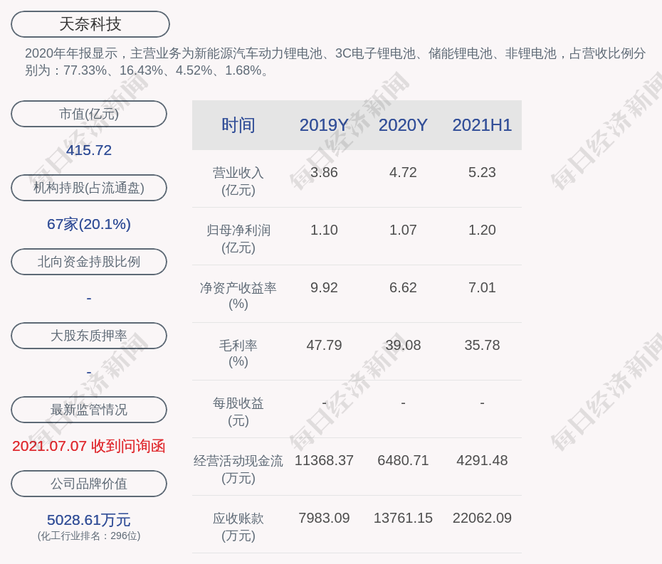 2020年年报显示,天奈科技的主营业务为新能源汽车动力锂电池、3C电子锂电池、储能锂电池、非锂电池,占营收比例分别为:77.33%、16.43%、4.52%、1.68%。