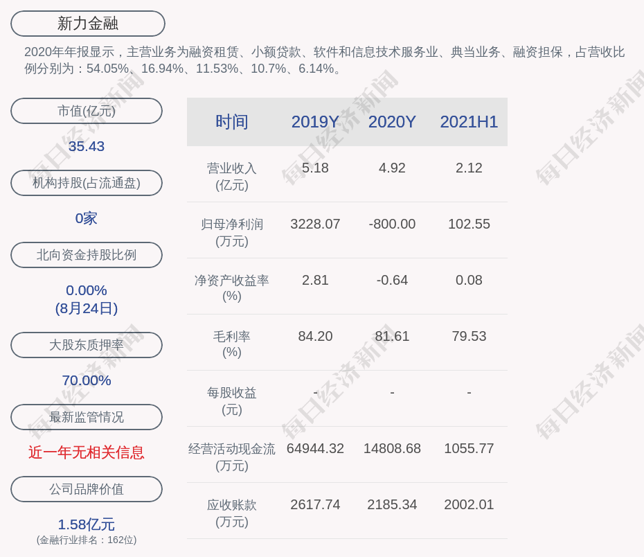 2020年年报显示,新力金融的主营业务为融资租赁、小额贷款、软件和信息技术服务业、典当业务、融资担保,占营收比例分别为:54.05%、16.94%、11.53%、10.7%、6.14%。