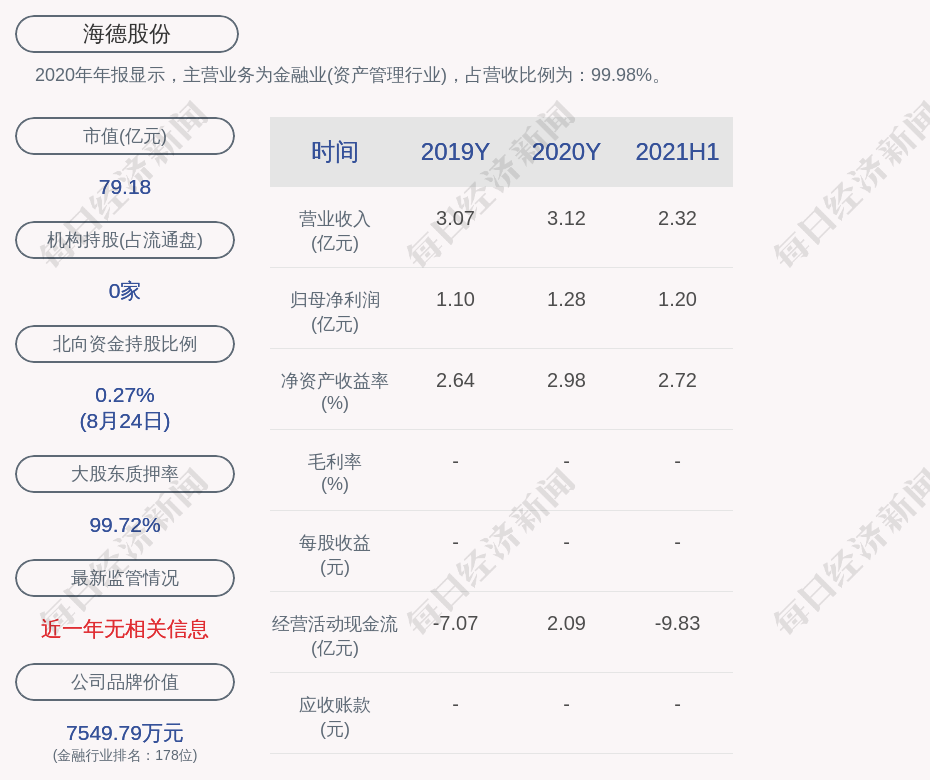 2020年年报显示,海德股份的主营业务为金融业(资产管理行业),占营收比例为:99.98%。