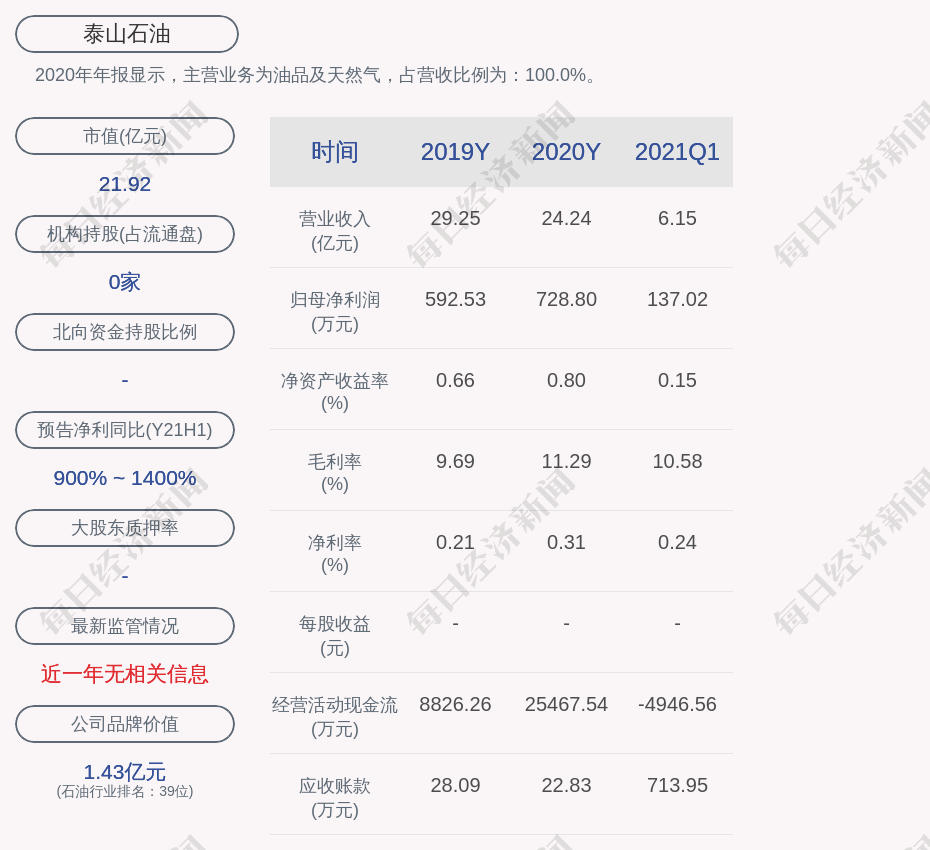 2020年年报显示,泰山石油的主营业务为油品及天然气,占营收比例为:100.0%。