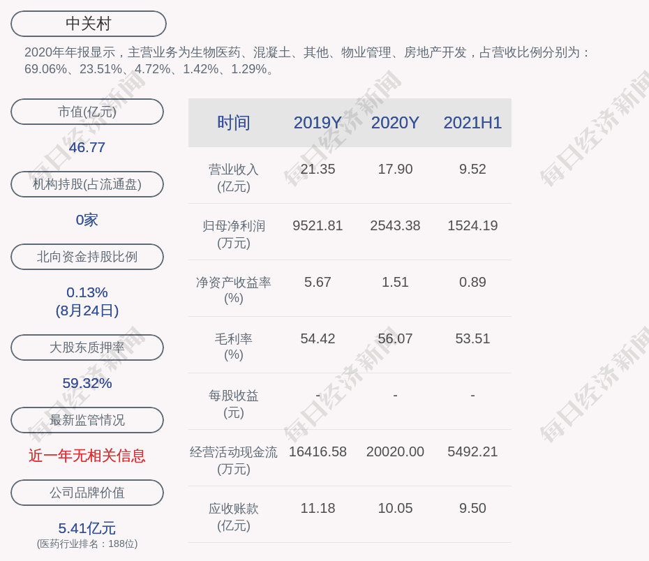 2020年年报显示,中关村的主营业务为生物医药、混凝土、其他、物业管理、房地产开发,占营收比例分别为:69.06%、23.51%、4.72%、1.42%、1.29%。