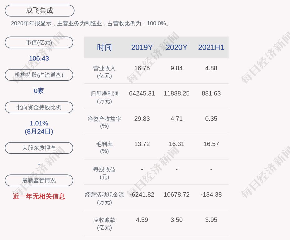 2020年年报显示,成飞集成的主营业务为制造业,占营收比例为:100.0%。