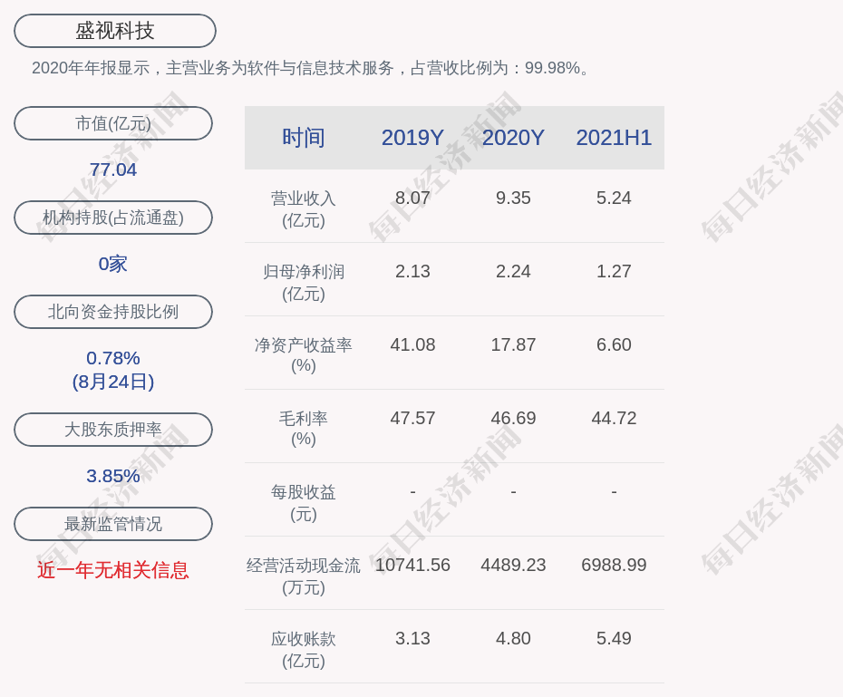 2020年年报显示,盛视科技的主营业务为软件与信息技术服务,占营收比例为:99.98%。