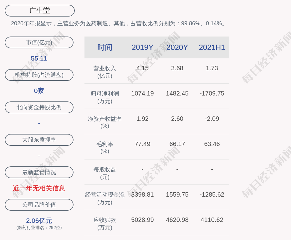 2020年年报显示,广生堂的主营业务为医药制造、其他,占营收比例分别为:99.86%、0.14%。