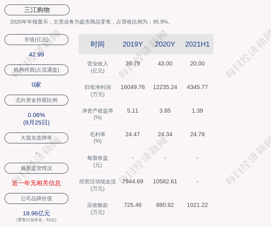 2020年年报显示,三江购物的主营业务为超市商品零售,占营收比例为:95.9%。