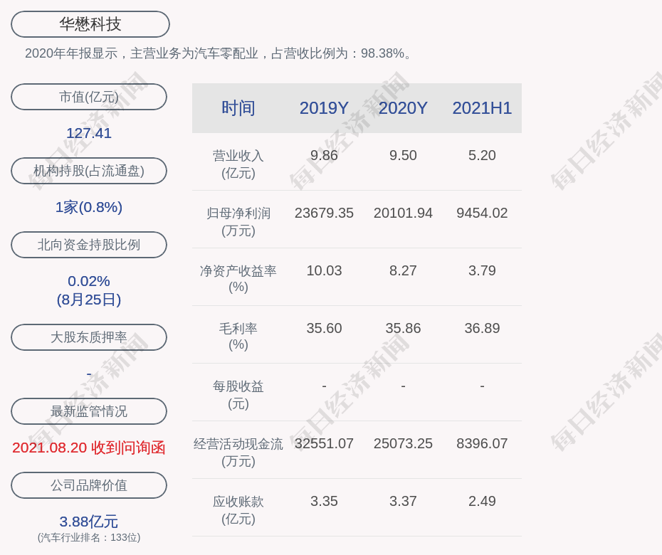 2020年年报显示,华懋科技的主营业务为汽车零配业,占营收比例为:98.38%。