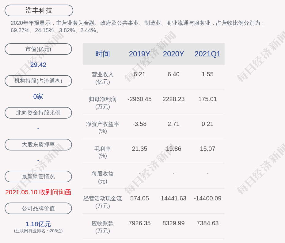 2020年年报显示,浩丰科技的主营业务为金融、制造业、商业流通与服务业等。