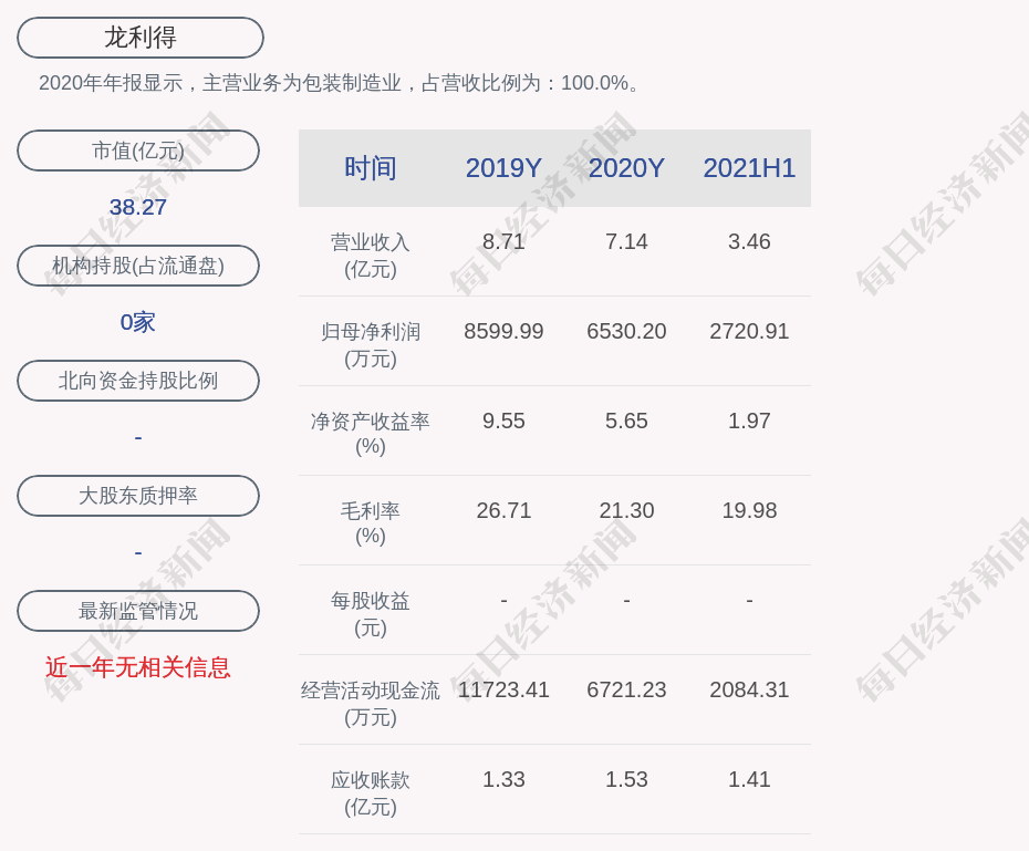 2020年年报显示,龙利得的主营业务为包装制造业,占营收比例为:100.0%。