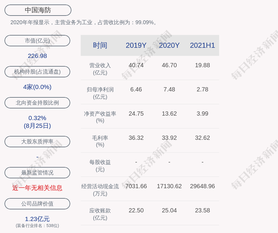 每经AI快讯,中国海防(SH 600764,收盘价:31.94元)8月26日晚间发布半年度业绩报告称,2021年上半年营业收入约19.88亿元,同比增加13.75%;归属于上市公司股东的净利润盈利约2.78亿元,同比增加24.95%;基本每股收益盈利0.391元,同比增加19.35%。分配方案为:公司不进行利润分配、公积金转增股本。