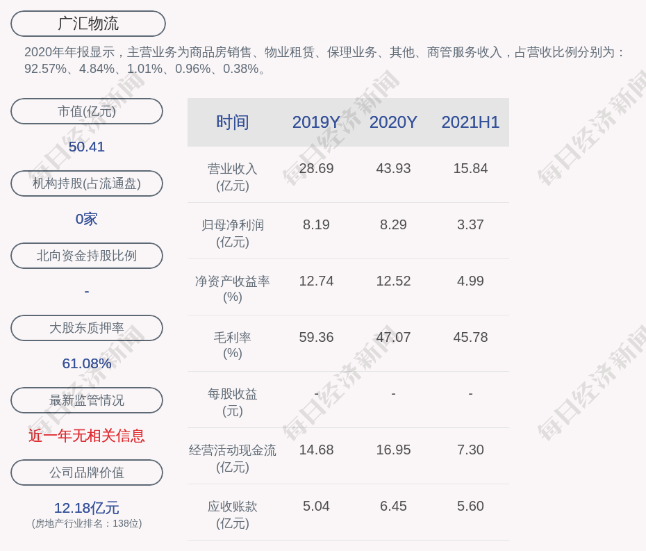 2020年年报显示,广汇物流的主营业务为商品房销售、物业租赁、保理业务、其他、商管服务收入,占营收比例分别为:92.57%、4.84%、1.01%、0.96%、0.38%。