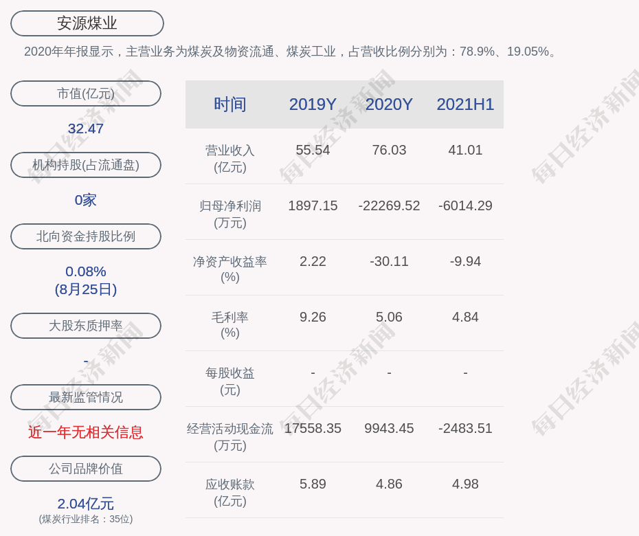 2020年年报显示,安源煤业的主营业务为煤炭及物资流通、煤炭工业,占营收比例分别为:78.9%、19.05%。