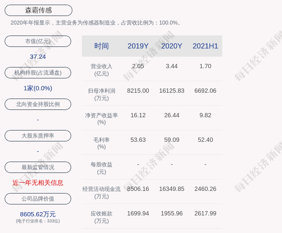 2020年年报显示,森霸传感的主营业务为传感器制造业,占营收比例为:100.0%。