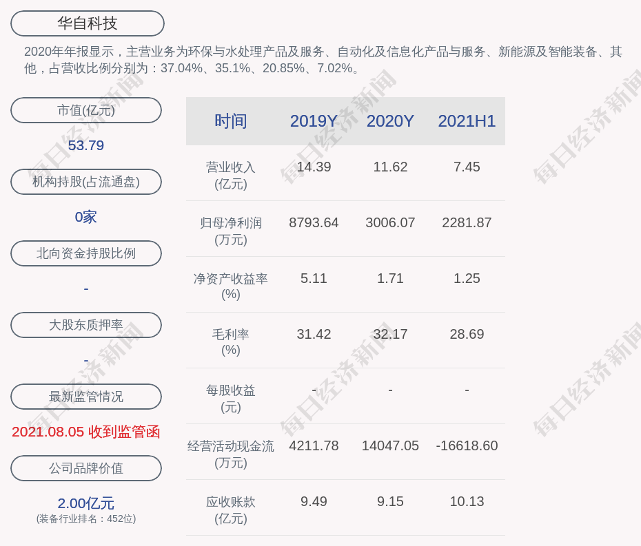 2020年年报显示,华自科技的主营业务为环保与水处理产品及服务、自动化及信息化产品与服务、新能源及智能装备、其他,占营收比例分别为:37.04%、35.1%、20.85%、7.02%。