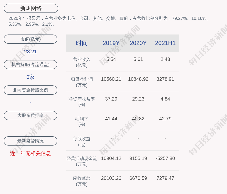 2020年年报显示,新炬网络的主营业务为电信、金融、其他、交通、政府,占营收比例分别为:79.27%、10.16%、5.36%、2.95%、2.1%。