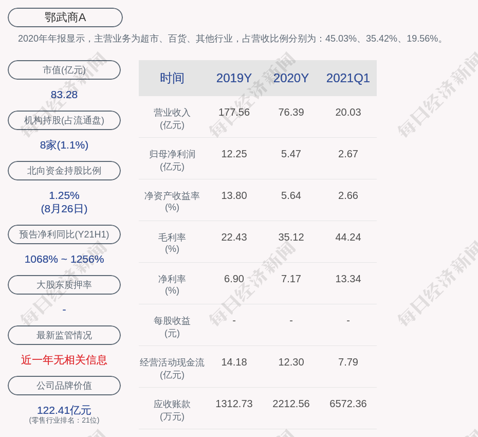 2020年年报显示,鄂武商A的主营业务为超市、百货、其他行业,占营收比例分别为:45.03%、35.42%、19.56%。