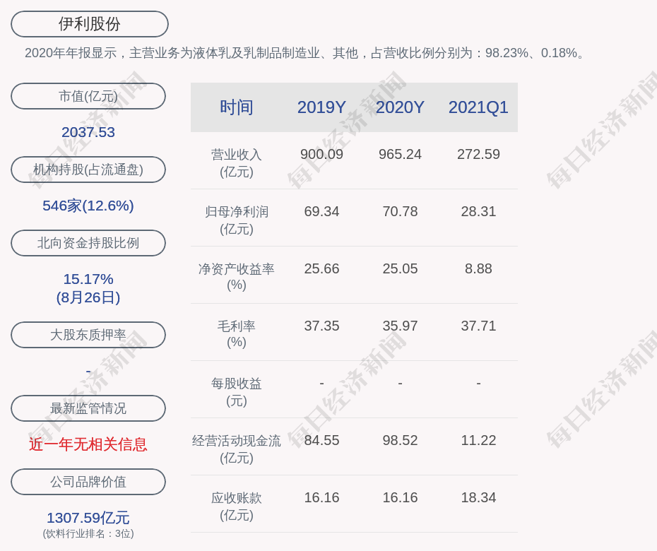 2020年年报显示,伊利股份的主营业务为液体乳及乳制品制造业、其他,占营收比例分别为:98.23%、0.18%。
