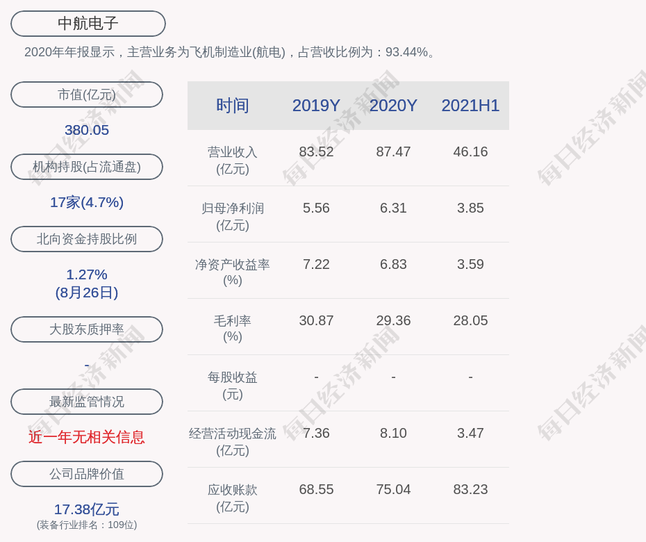 2020年年报显示,中航电子的主营业务为飞机制造业(航电),占营收比例为:93.44%。