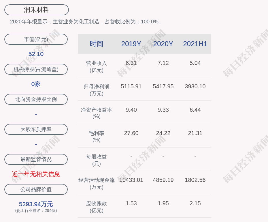 2020年年报显示,润禾材料的主营业务为化工制造,占营收比例为:100.0%。