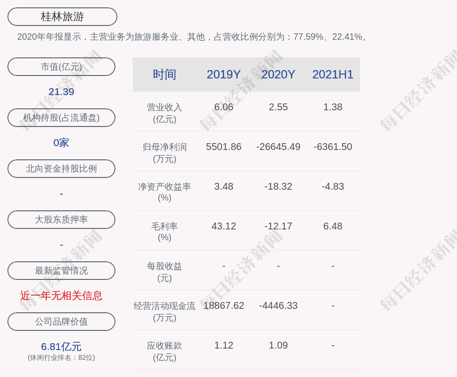 2020年年报显示,桂林旅游的主营业务为旅游服务业、其他,占营收比例分别为:77.59%、22.41%。