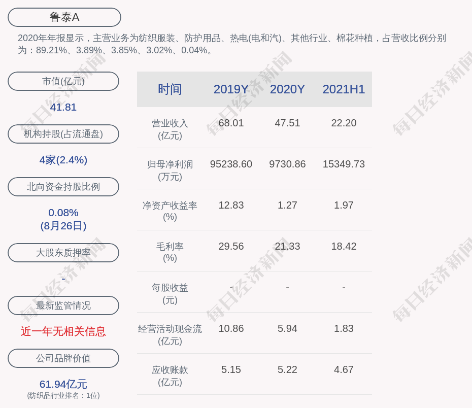 2020年年报显示,鲁泰A的主营业务为纺织服装、防护用品、热电(电和汽)、其他行业、棉花种植,占营收比例分别为:89.21%、3.89%、3.85%、3.02%、0.04%。