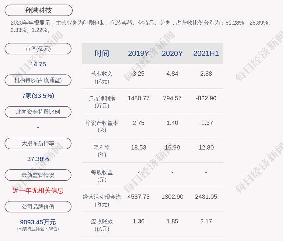2020年年报显示,翔港科技的主营业务为印刷包装、包装容器、化妆品、劳务,占营收比例分别为:61.28%、28.89%、3.33%、1.22%。
