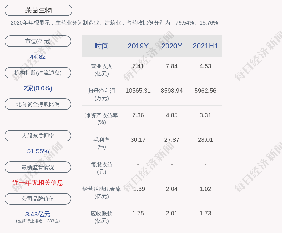 2020年年报显示,莱茵生物的主营业务为制造业、建筑业,占营收比例分别为:79.54%、16.76%。