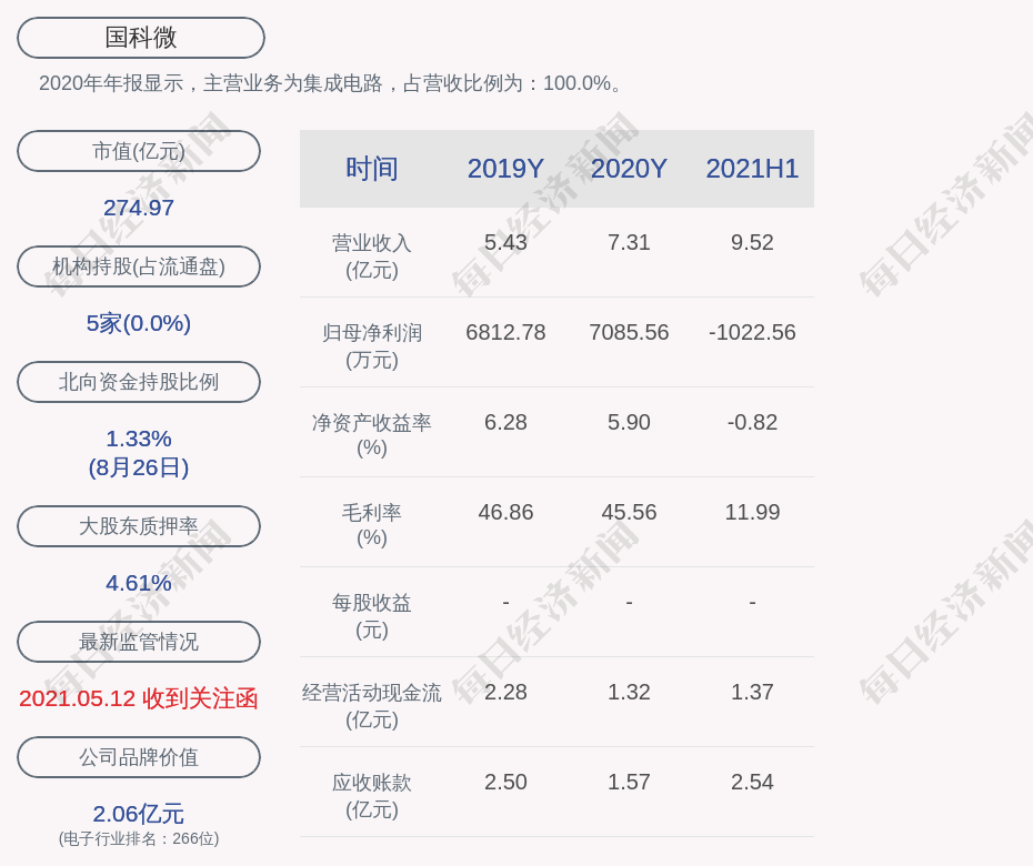 每经AI快讯,国科微(SZ 300672,收盘价:152.49元)8月27日晚间发布半年度业绩报告称,2021年上半年营业收入约9.52亿元,同比增加393.08%;归属于上市公司股东的亏损约1023万元;基本每股亏损0.0567元。分配方案为:不分红、不送红股、不转增。