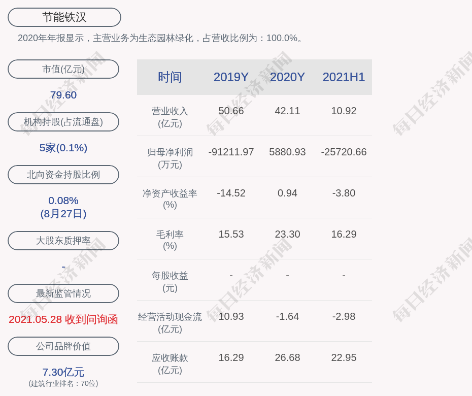 每经AI快讯,节能铁汉(SZ 300197,收盘价:2.82元)8月29日晚间发布半年度业绩报告称,2021年上半年营业收入约10.92亿元,同比减少21.3%;归属于上市公司股东的净利润亏损约2.57亿元;基本每股收益亏损0.1065元。分配方案为:不分红、不送红股、不转增。2020年同期营业收入约13.88亿元;归属于上市公司股东的净利润亏损约1.68亿元;基本每股收益亏损0.0714元。