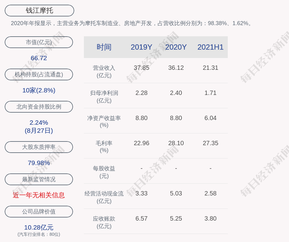 2020年年报显示,钱江摩托的主营业务为摩托车制造业、房地产开发,占营收比例分别为:98.38%、1.62%。
