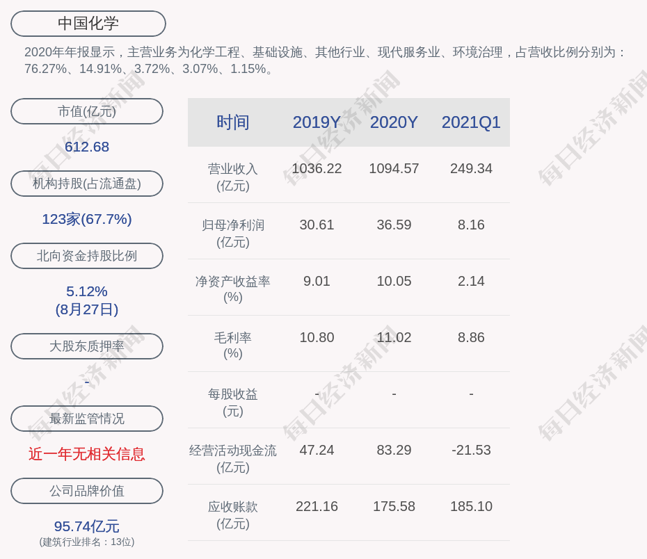 2020年年报显示,中国化学的主营业务为化学工程、基础设施、其他行业、现代服务业、环境治理。