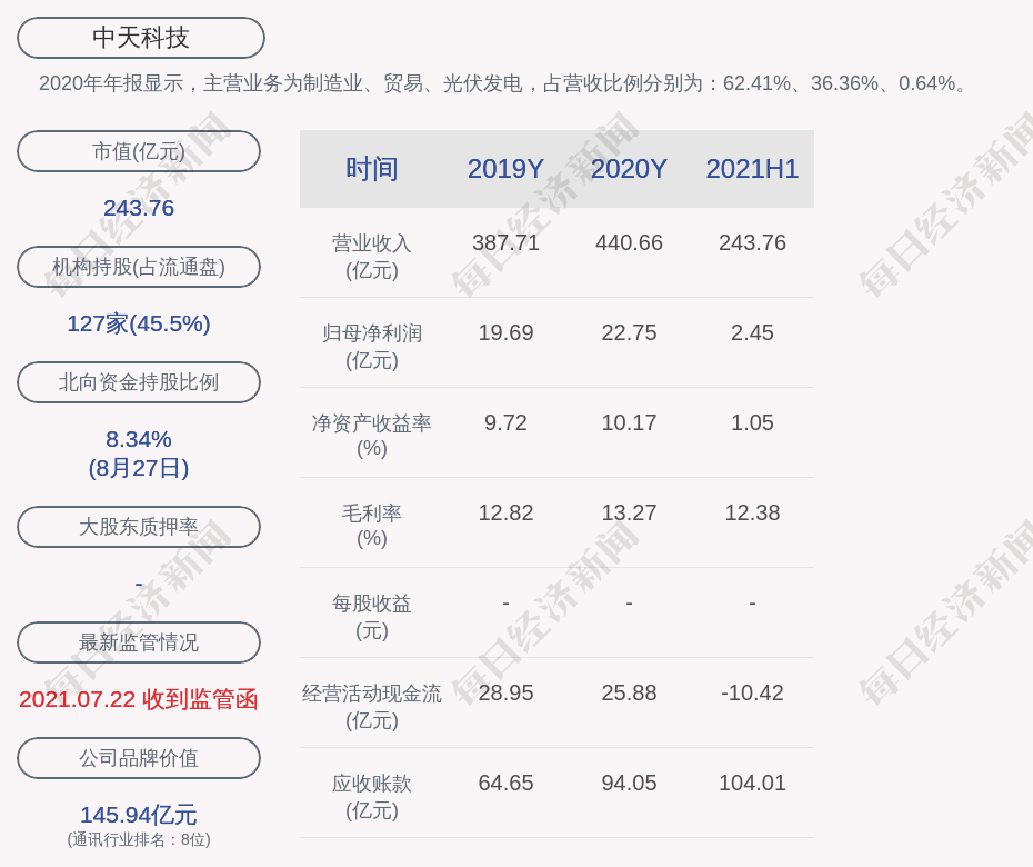 每经AI快讯,中天科技(SH 600522,收盘价:7.95元)8月29日晚间发布半年度业绩报告称,2021年上半年营业收入约243.76亿元,同比增加16.64%;归属于上市公司股东的净利润盈利约2.45亿元,同比减少77.27%;基本每股收益盈利0.081元,同比减少77.31%。