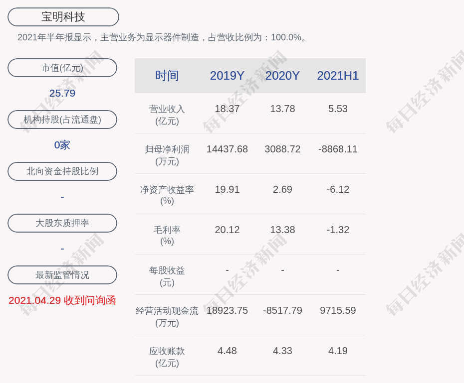 2021年半年报显示,宝明科技的主营业务为显示器件制造。