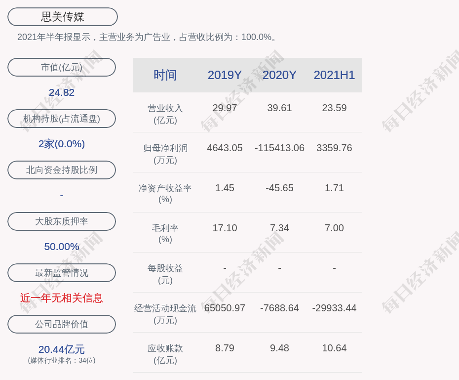 2021年半年报显示,思美传媒的主营业务为广告业,占营收比例为:100.0%。