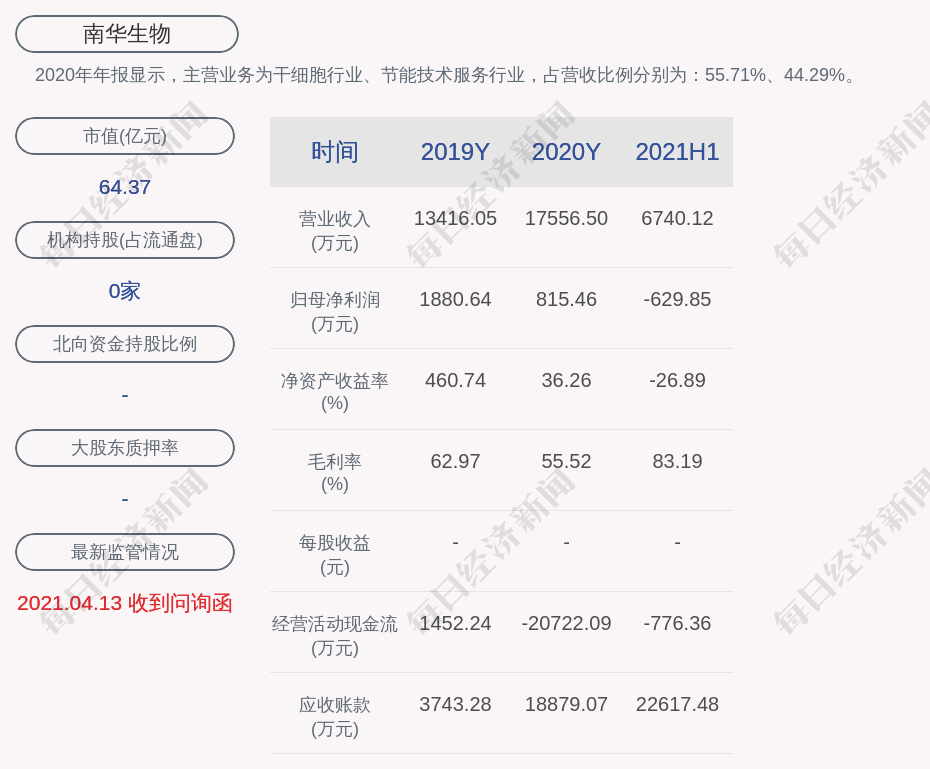 2020年年报显示,南华生物的主营业务为干细胞行业、节能技术服务行业。