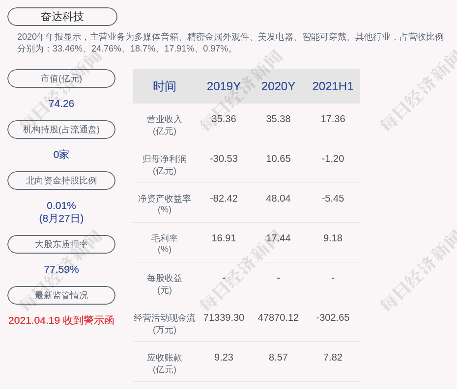 2020年年报显示,奋达科技的主营业务为多媒体音箱、精密金属外观件、美发电器、智能可穿戴、其他行业,占营收比例分别为:33.46%、24.76%、18.7%、17.91%、0.97%。