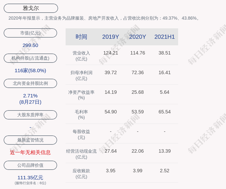 2020年年报显示,雅戈尔的主营业务为品牌服装、房地产开发收入,占营收比例分别为:49.37%、43.86%。