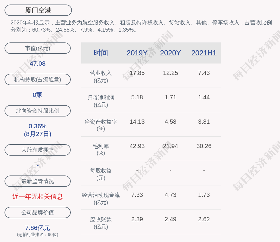 2020年年报显示,厦门空港的主营业务为航空服务收入、租赁及特许权收入、货站收入、其他、停车场收入,占营收比例分别为:60.73%、24.55%、7.9%、4.15%、1.35%。