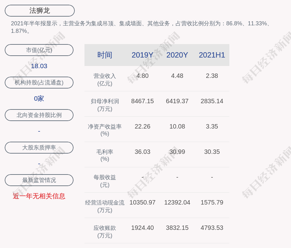 2021年半年报显示,法狮龙的主营业务为集成吊顶、集成墙面、其他业务,占营收比例分别为:86.8%、11.33%、1.87%。