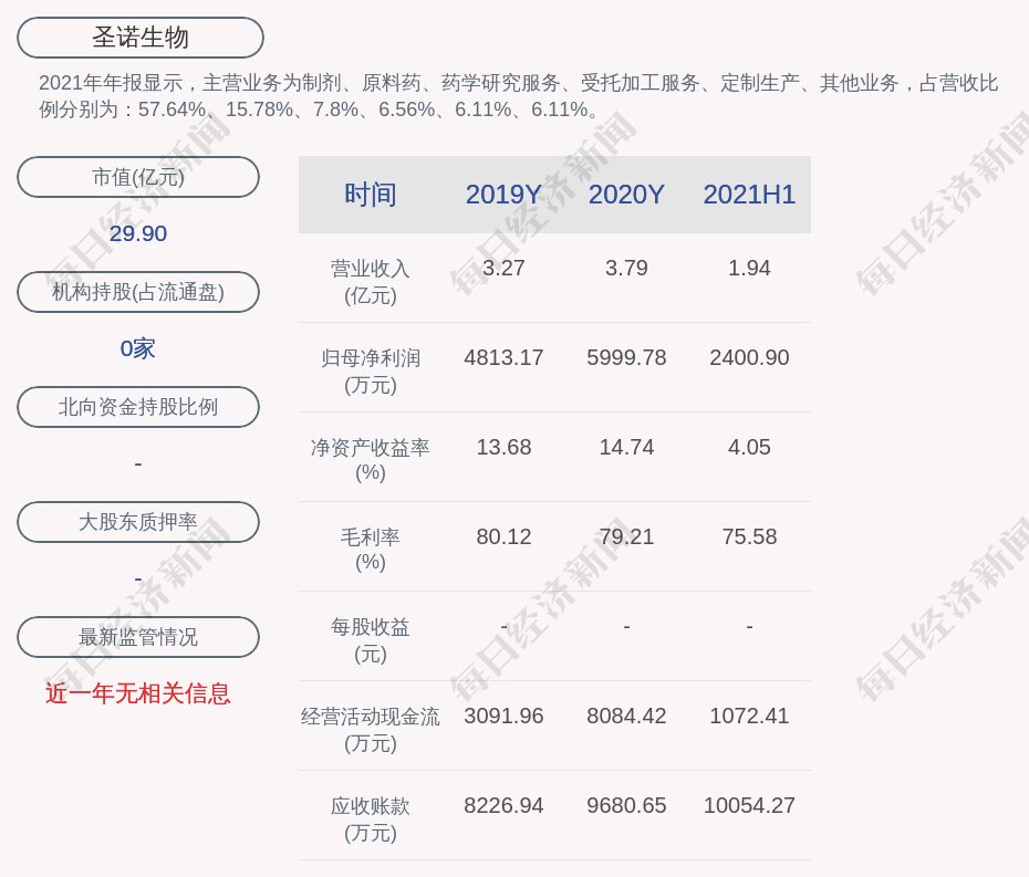 2021年年报显示,圣诺生物的主营业务为制剂、原料药、药学研究服务、受托加工服务、定制生产、其他业务,占营收比例分别为:57.64%、15.78%、7.8%、6.56%、6.11%、6.11%。