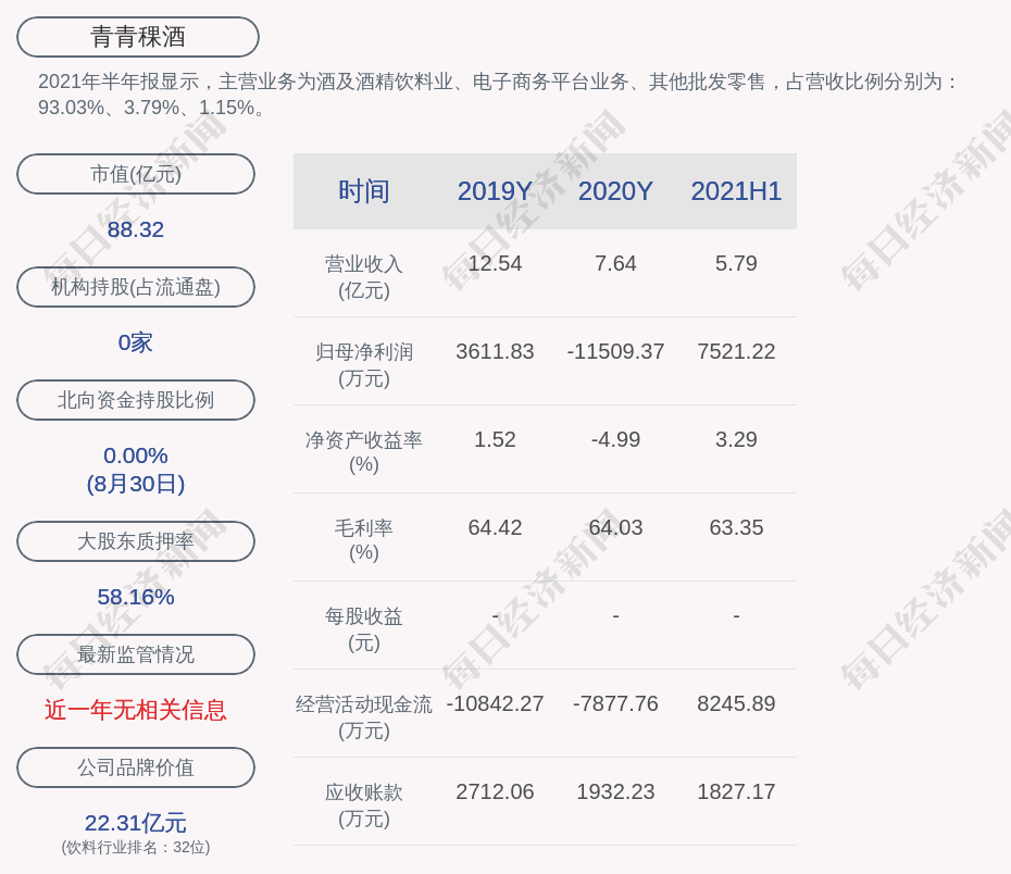 2021年半年报显示,青青稞酒的主营业务为酒及酒精饮料业、电子商务平台业务、其他批发零售,占营收比例分别为:93.03%、3.79%、1.15%。