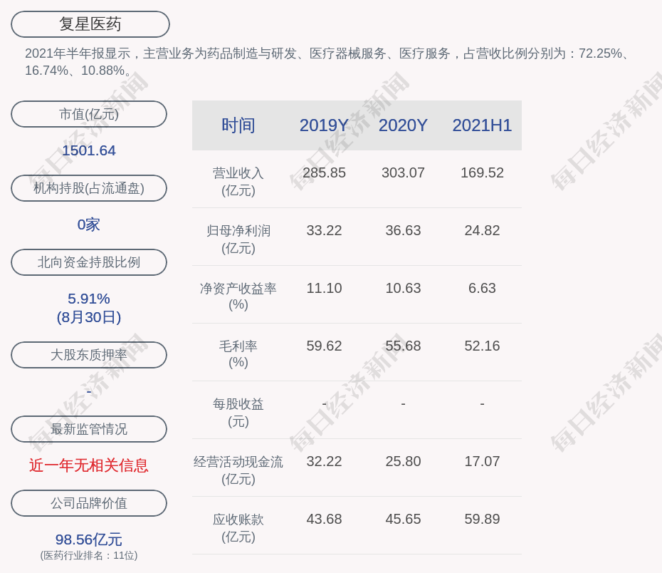 2021年半年报显示,复星医药的主营业务为药品制造与研发、医疗器械服务、医疗服务,占营收比例分别为:72.25%、16.74%、10.88%。
