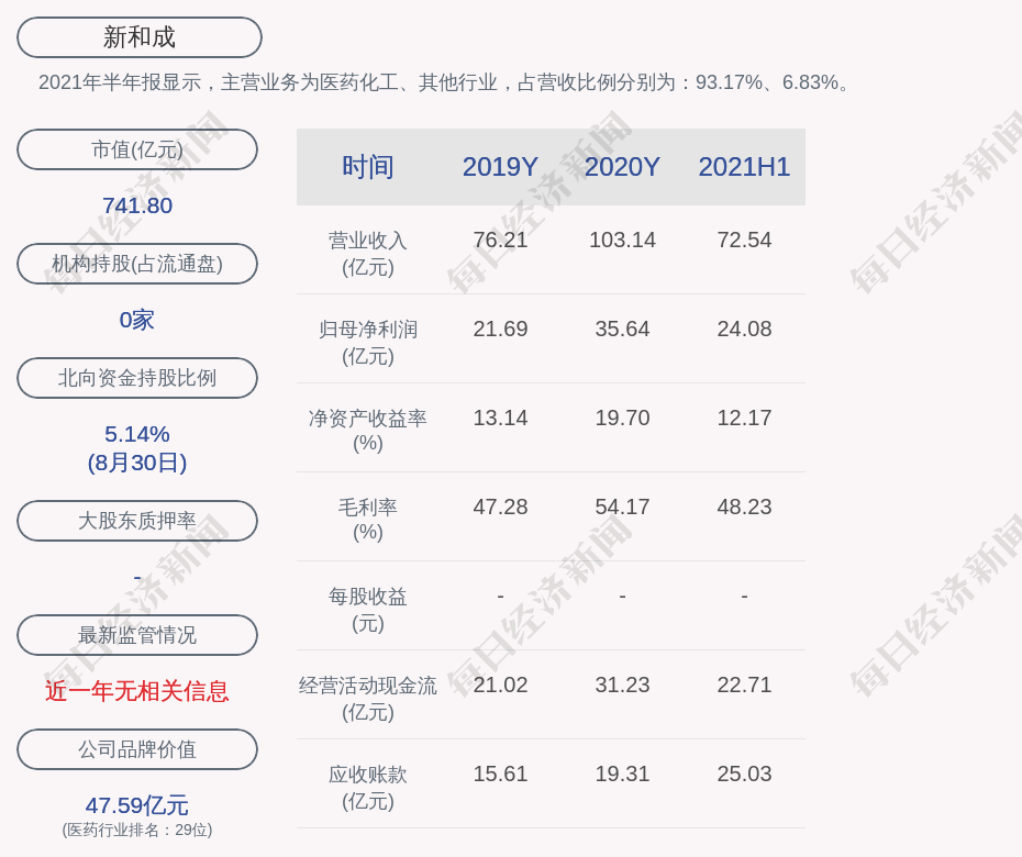 2021年半年报显示,新和成的主营业务为医药化工、其他行业,占营收比例分别为:93.17%、6.83%。