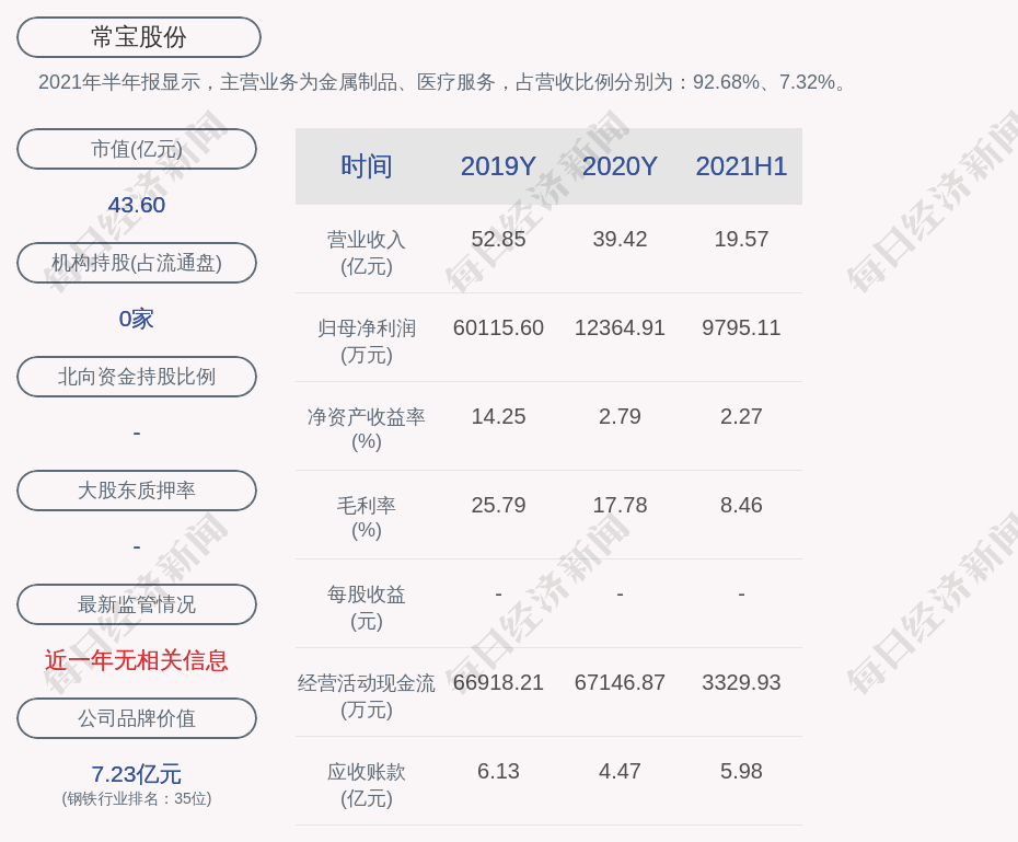 2021年半年报显示,常宝股份的主营业务为金属制品、医疗服务,占营收比例分别为:92.68%、7.32%。