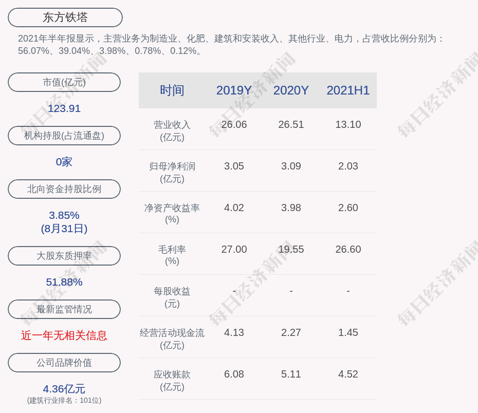 2021年半年报显示,东方铁塔的主营业务为制造业、化肥、建筑和安装收入、其他行业、电力,占营收比例分别为:56.07%、39.04%、3.98%、0.78%、0.12%。