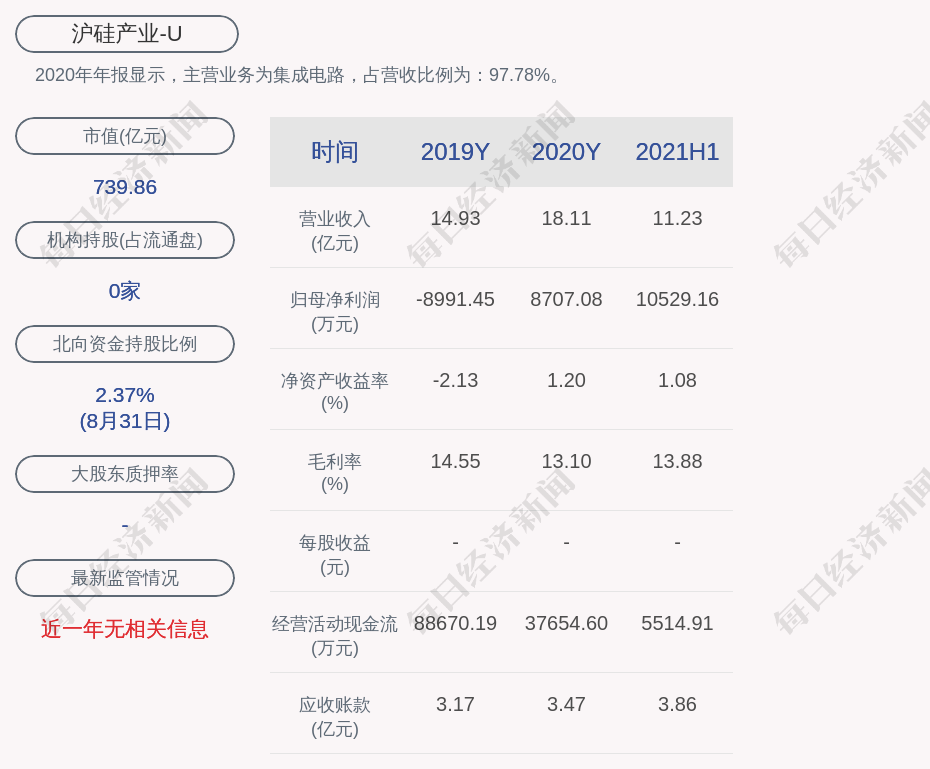 2020年年报显示,沪硅产业的主营业务为集成电路,占营收比例为:97.78%。