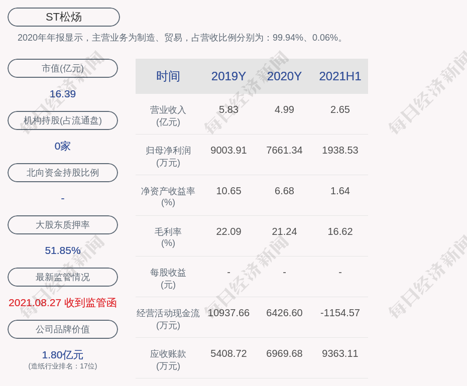 2020年年报显示,ST松炀的主营业务为制造、贸易,占营收比例分别为:99.94%、0.06%。