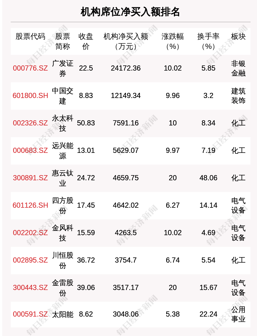 在龙虎榜中,涉及机构专用席位的个股有33只,净买入额前三的是广发证券、中国交建、永太科技,分别为2.42亿元、1.21亿元、7591.16万元。