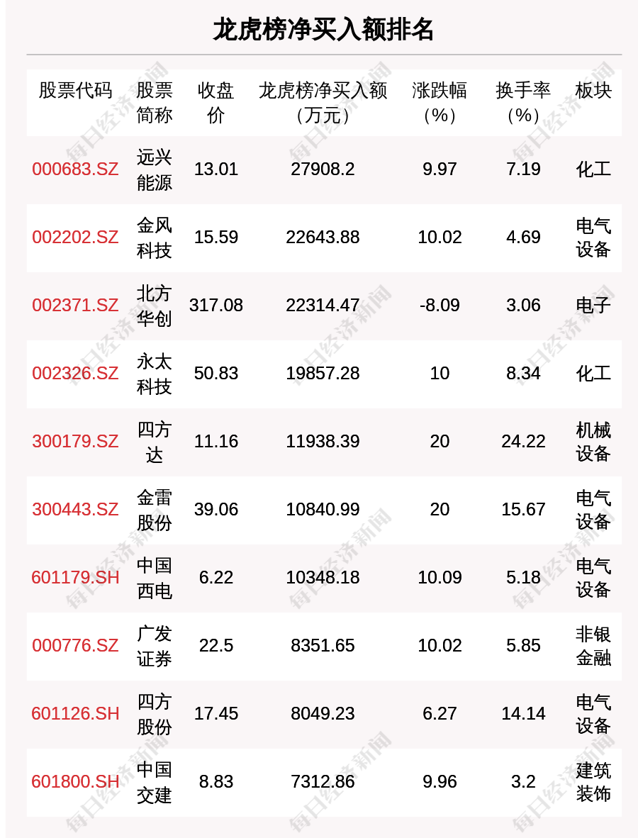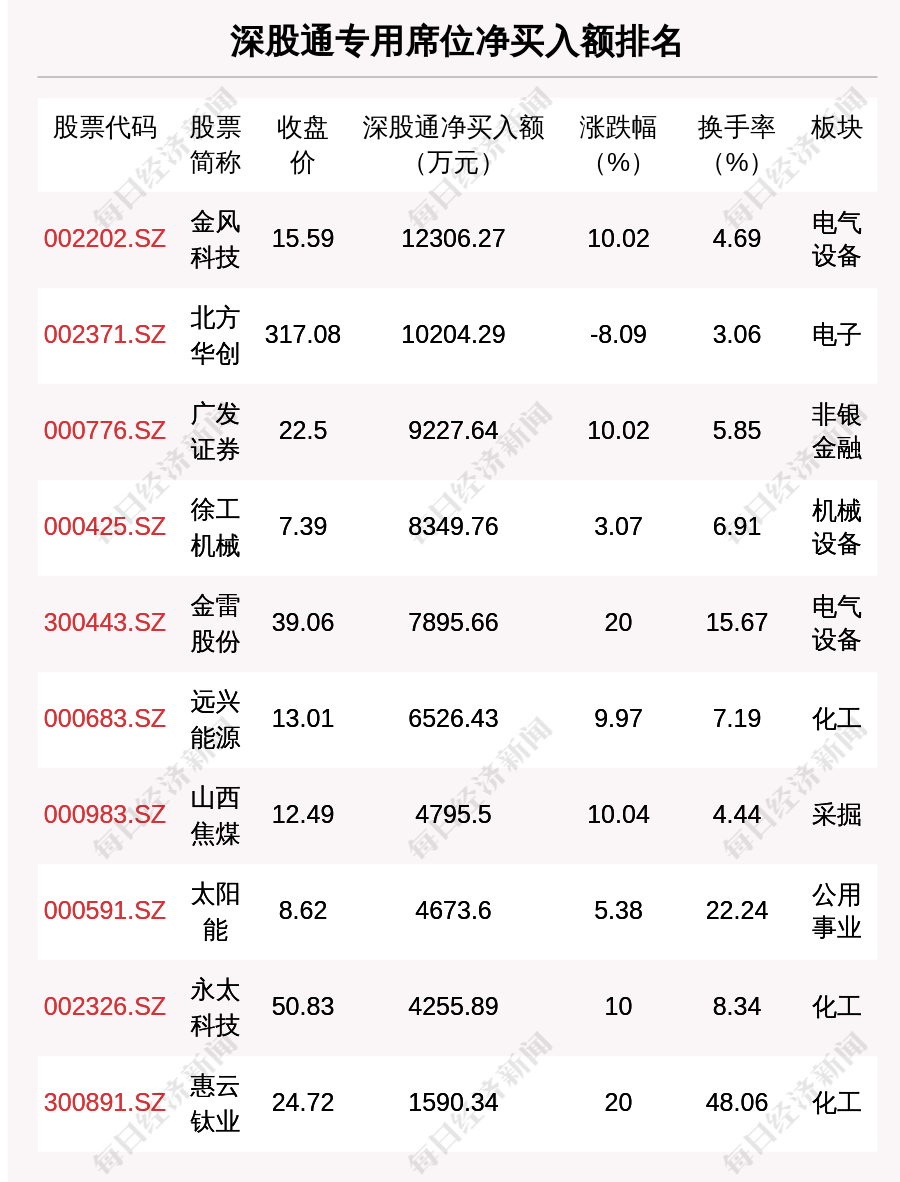 在龙虎榜中,涉及深股通专用席位的个股有13只,金风科技的深股通专用席位净买入额最大,净买入1.23亿元。