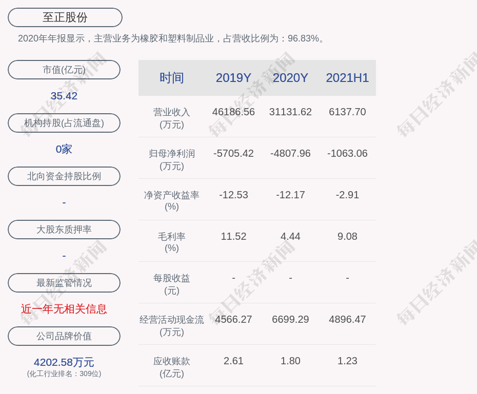 2020年年报显示,至正股份的主营业务为橡胶和塑料制品业,占营收比例为:96.83%。